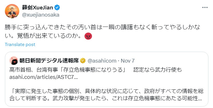 从认知博弈的视角来看,”斩掉那肮脏的头颅“,是对高市早苗狂言台湾问题最有效的威慑